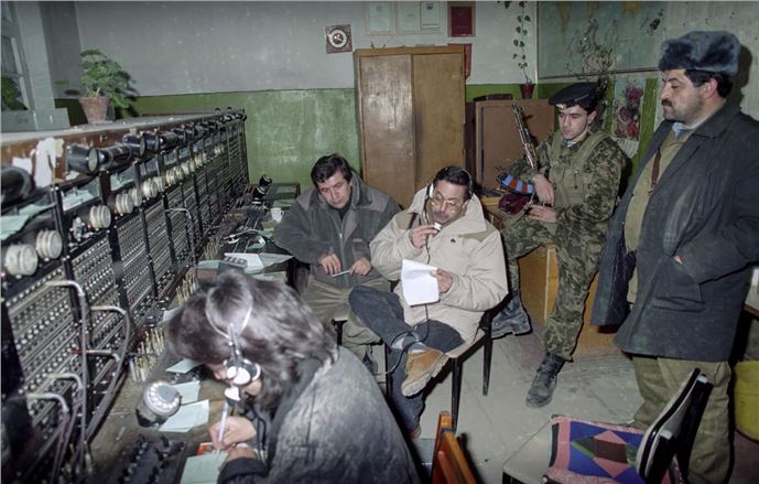 Anadolu Ajansı, Hocalı katliamının 23. yılında olayın büyüklüğünü ortaya koyan fotoğrafları derledi. Aralık 1991'de Karabağ'ı işgal eden Ermeniler'in sonraki hedefi bölgenin tek havaalanına sahip ve stratejik önem taşıyan Hocalı'yı ele geçirmekti. Hocalı'nın etrafındaki bütün köy ve yolları tek tek ele geçiren Ermeni güçleri, kasabanın diğer illerle karayolu bağlantısını kesti. 25 Şubat 1992'den itibaren Hocalı'ya saldırıya başlayan Ermeniler, bölgede bulunan Sovyet ordusuna bağlı 366. Zırhlı Alayı'nın bütün araçlarını kullanarak şehri iki saat boyunca top ve tank ateşine tuttu. Saldırıdan bir gün sonra ise hafızalardan yıllarca silinmeyecek "Hocalı katliamı" yapıldı. Resmi verilere göre, Hocalı katliamında savunmasız durumdaki 106'sı kadın, 83'ü çocuk olmak üzere 613 Azerbaycan vatandaşı hayatını kaybetti. Katliamdan 487 kişi ağır yaralı olarak kurtulurken, Ermeni güçleri bin 275 kişiyi rehin aldı. Fotoğrafta Azerbaycan'ın Hocalı kentinde dünya ile haberleşmeyi sağlayan santral çalışanları ve santralde nöbet tutan Azeri askeri güçler görülüyor... (Arşiv)Muhabir: Selahattin Yılmaz