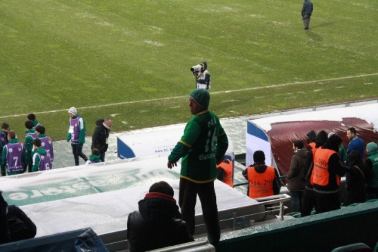 Ziraat Türkiye Kupası grup maçlarının ardından gelinen eleme turunda Bursaspor evinde İstanbul Başakşehir’i ağırlıyor. Yoğun kar yağışında oynanan müsabakayı izlemek için Atatürk Stadyumu’na az sayıda taraftar gelirken, tribünlerde yerlerini alan seyirciler ısınmak için sahaya çıkan oyuncuları tek tek çağırarak alkışladı. Taraftarlar maçın başlama düdüğünün ardından yaptıkları tezahüratlarla takımlarına destek oldu.