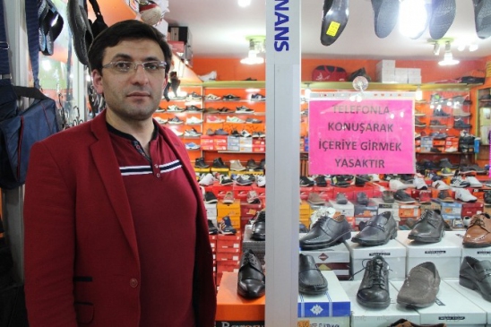 (ÖZEL HABER)-Erzurum’da ayakkabı satıcılığı yapan Yakup Karataş, aldığı ilginç bir kararla müşterilerinin telefonla konuşarak dükkana girmesini yasakladı.