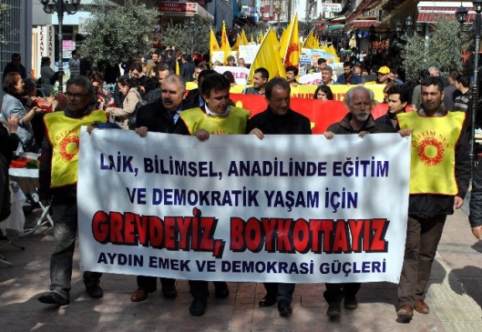 Birleşik Haziran Hareketi Aydın Platformu ve Eğitim Sen Aydın Şubesi işbirliğinde düzenlenen ’Laik ve Bilimsel Eğitim’ eylemine katılan grup üyeleri, Efeler merkez Sevgi Yolu’nda toplandı. Aydın Tabip Odası Başkanı Dr. Metin Aydın ve yönetim kurulu üyelerinin de destek verdiği eylemde, grup üyeleri Gençlik Caddesi ve Kültür Sanat Sokağı istikametinden yürüyerek Okullar Bölgesi’nde toplandı.