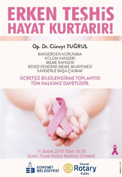 Edremit Belediyesi ve Edremit Rotary Kulübü’nün birlikte düzenleyeceği “Erken Teşhis Hayat Kurtarır” konulu bilgilendirme toplantısı, 14 Şubat Cumartesi günü saat 15.30’da Şükrü Tunar Kültür Merkezi’nde gerçekleştirilecek.