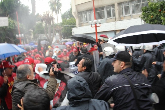 Belediye binasının hizasında önleri çevik kuvvet ekipleri tarafından kesilen işçiler, binanın giriş kapısına kadar yürümekte ısrar etti. Sendika yöneticileriyle emniyet yetkilileri arasında yapılan görüşmelerde de daha ileriye gitmelerine izin verilmemesi üzerine işçiler, çevik kuvvet ekiplerinin üzerine yürüyerek, barikatı açmak istedi. Çevik kuvvet ekipleri, ısrarla kapıya ulaşmaya çalışan işçilere gazla müdahale etti. Bir taraftan sağanak yağmurun da devam ettiği olaylar sırasında Genel-İş Mersin Şube Başkanı Kemal Göksoy ve bazı işçiler gazdan fenalaştı.