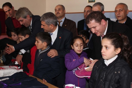 Yapılan konuşmaların ardından öğrencilere giyim malzemesi dağıtıldı.