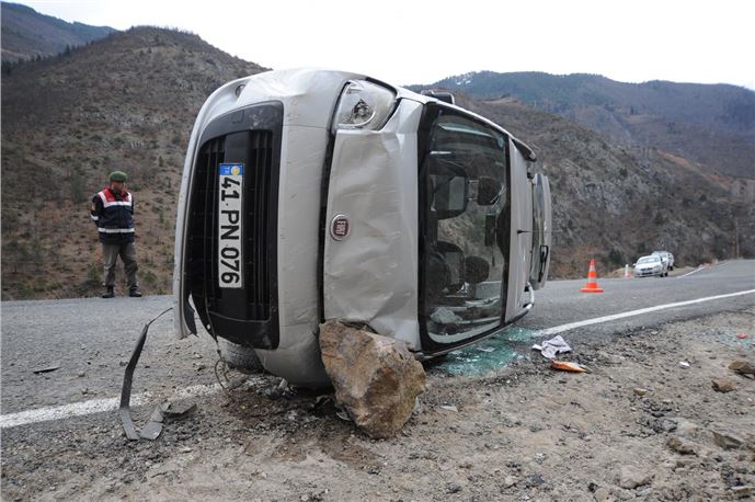 Artvin'de yamaçtan yuvarlanan kayadan kaçmaya çalışırken yaptığı manevra sonucu aracı devrilen sürücü ile yanındaki eşi yaralandı.Muhabir: Bayram SARAYOĞLU