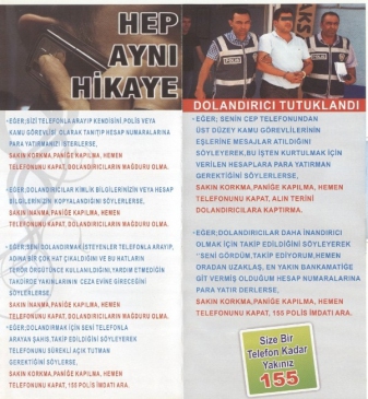 2014 yılı içerisinde kontör dolandırıcılığı ile ilgili Asayiş Şube Müdürlüğüne, Polis Merkezlerine ve 155 Polis İmdat hattına toplam 8 bin 625 adet bildirimde bulunulduğuna ve bu kadar teşebbüsten sadece 181 vatandaşın dolandırıcıların mağduru olduğuna dikkat çekilen açıklamada şöyle denildi; “8 bin 444 vatandaşımız ise proje kapsamında bilinçlendirilmeleri nedeniyle 155 Polis İmdat Hattına ihbarda bulunarak ekiplerin yardımıyla dolandırıcıların oyununa düşmemiştir. İlimiz merkezi bölgede, bankalar civarında görev yapan Güven Timlerinin dikkatli ve duyarlı çalışmaları sonucunda ise, 2014 yılı içerisinde 126 vatandaşın dolandırıcılara göndermek üzere oldukları toplam 1 milyon 345 bin 820 TL paranın gönderilmesi engellenmiştir. 2014 yılında ilimizde iletişim araçları kullanılarak yapılan dolandırıcılık olaylarına yönelik 13 olay ile ilgili olarak, 19 şüpheli yakalanmış, bunlardan 9’u tutuklanmış ve şüphelilerden çıkan 320 Euro, 3 bin 150 TL para, 5 bilezik, 1 yarım, 3 çeyrek ve 1 reşat altın müştekilere teslim edilmiştir.”