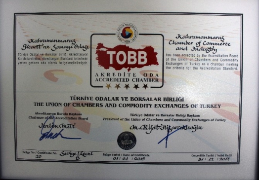 Türkiye Odalar ve Barsalar Birliği (TOBB) tarafından hizmet standartları doğrultusunda 2002 yılından bu yana uygulanan akredite odalara Kahramanmaraş da katılmıştı. Politika oluşturma, mali yönetim, iş planlaması, üye ilişkiler, iş geliştirme gibi 13 ayrı kategoride başarılı sonuçlar elde eden KMTSO’ya, Türkiye Odalar ve Borsalar Birliği tarafından 5 yıldızlı uluslararası niteliği bulunan akreditasyon belgesi verildi.