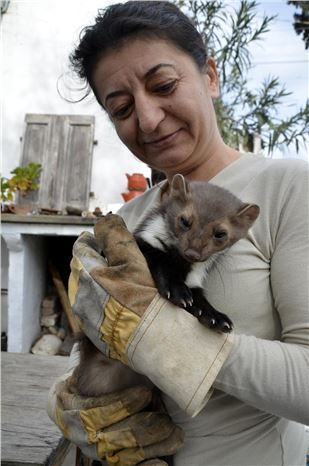 Muğla'nın Bodrum ilçesinde, yaralı halde bulunan kaya sansarı, Doğa Koruma ve Milli Parklar Müdürlüğü ekiplerine teslim edildi. Yaralı Sansarı bulan12 yaşındaki Can Hakgüden'in annesi Hacer Kunduz (fotoğrafta) sansar ile yakından ilgilendi.Muhabir: Ali Ballı