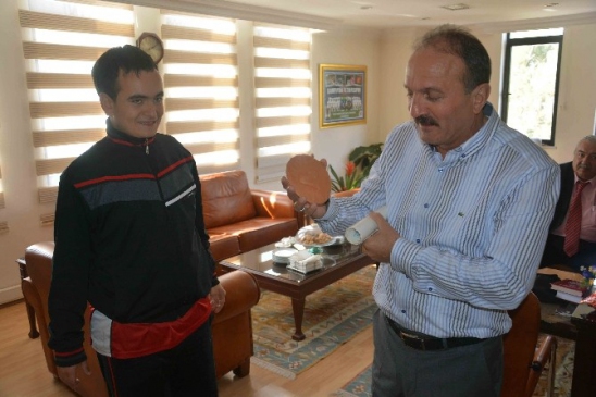 Fethiye Belediye Başkanı Behçat Saatcı’nın Fethiyespor formasını hediye ettiği engelli Berk, Başkan’ı makamında ziyaret ederek elelriyle yaptığı amblemi takdim etti.