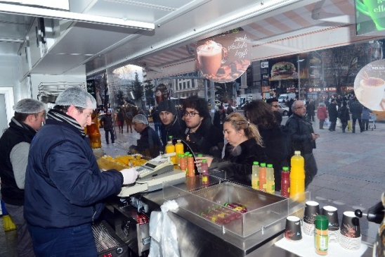 Başkent’te sosyal hayatının merkezi konumunda olan Milli Müdafaa Caddesi çıkışına yerleştirilen yeni BELSO aracında eski ürünlerle birlikte salep ve sıcak çikolata da satışa sunulmaya başlandı. Başkent’te soğuk hava nedeniyle yoğun ilgi gören yeni ürünler, kentin çeşitli yerlerinde meyve suyu satışı yapan BELSO satış noktalarının da yenilenmesi ile yaygınlaşacak.