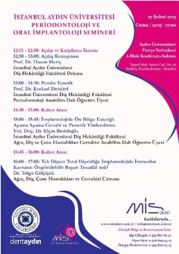 İstanbul Aydın Üniversitesi Diş Hekimliği Fakültesi Hastanesi Dentaydın ve Mis Dent işbirliğiyle 27 Şubat 2015 Cuma günü İstanbul Aydın Üniversitesi Florya Yerleşkesi’nde "Periodontoloji ve Oral İmplantoloji" eğitimi düzenlenecek.