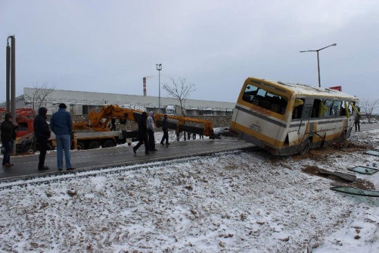 Edinilen bilgiye göre, gece vardiyasından çıkan işçileri taşıyan servis aracı fabrika girişinde iddialara göre, önünde bulunan otomobile çarpmamak için servis şoförünün yaptığı manevra sonrası elektrik direğine çarpan otobüs devrildi. Kazada ilk belirlemelere göre fabrika işçilerinden Yakup Bedir, Orhan Şahin, İlker Babadağ, Tahir Yürük, İbrahim Göktaş, Muhuttin Ergin, Halil Güdük, Nedim Tekbaş, Dündar Yıldırım, Süleyman Toprak, Hamza Aydın, Serkan Özmen, Ali Kırar, Ramazan Albayrak, Güven Böyden, Mustafa Altıntop yaralanarak Ahi Evran Üniversitesi Eğitim ve Araştırma Hastanesinde tedavi altına alındı. Kaza sonrası trafik ekipleri kısa süreli yolu kapatırken, devrilen otobüs vinç yardımıyla kaldırıldı.