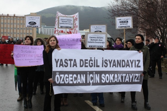 Kendilerine ‘Üniversiteli Kadınlar Platformu’ adını veren grup adına basın açıklaması yapan Şeyma Özberk, “Katiller, Tarsus- Mersin arası bir dolmuş seferinde çıktı kız kardeşimiz Özgecan’ın karşısına. Özgecan, 20 yaşında üniversite öğrencisiydi. Kız kardeşlerinin omuzlarında uğurlandı. Özgecan ve ailesi erkeklere saf tutturmadı. Şimdi Özgecan’ın kız kardeşleri, katillerden hesap sormak için sokak başlarını tutuyor, adını haykırıyor” dedi.