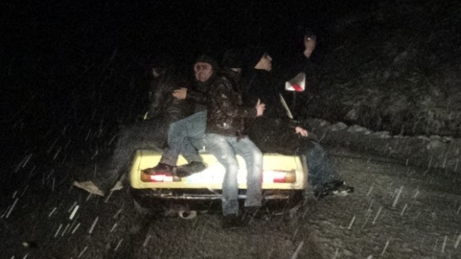 Zonguldak-Ereğli Karayolu’nda gece saatlerinde başlayan kar yağışı sürücülere zor anlar yaşattı. Kar yağışına hazırlıksız yakalanan bir otomobil yolda kayarak büyük tehlike atlattı. Kar lastiksiz yola çıkan otomobil yoluna devam edemeyince bir otobüsten inen işçiler önce otomobili iterek yola soktu, sonrada üstüne binip seyir halinde iken selfie çekti.