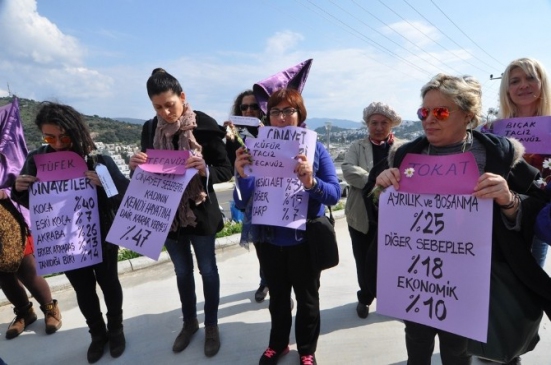 Cumhuriyet Mahallesi Kalekonut Sitesinde ki bir otopark alanında düzenlene eyleme Kadın dayanışma Derneği üyelerinin yanı sıra bazı sivil toplum kuruluşu üyeleri de katıldı. Ellerinde, “Hülya Yolcubal ayrıldığı erkek arkadaşı tarafından öldürüldü”, “Bugün Yağmur’un 19 yaşında öldürüldüğü gün”, “2014’de erkekler 294 kadını öldürdü” ve benzeri dövizlerle alanda bekleyen kadınların önlerinde de bir hediye paketi vardı.