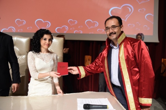Uşak’ta 14 Şubat Sevgililer Günü nedeni ile organize edilen etkinlikte 9 çiftin nikahı kıyıldı.