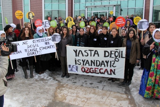 Mersin’de, vahşi bir şekilde katledilen Özgecan Aslan için tepkiler sürüyor. Van’da bir araya gelen yüzlerce kadın, Aslan’ın katledilmesini yaptıkları basın açıklamasıyla protesto etti. Van Büyükşehir Belediyesi Kadın Politikaları Daire Başkanlığı tarafından Rojin Kadın Yaşam Merkezi önünde düzenlenen basın açıklamasına HDP Van İl Eş Başkanı Derya Havya, DBP Van İl Eş Başkanı Hamiyet Şahin ve Van Büyükşehir Belediyesi Eş Başkanı Hatice Çoban’ın yanı sıra yüzlerce kadın katıldı. Rojin Kadın Yaşam Merkezi önünde “Yasta değil, isyandayız Özgecan” yazılı pankartı açan kadınlar, sık sık “Özgecan ölümsüzdür” sloganları attı. Burada bir açıklama yapan Rojin Kadın Yaşam Merkezi çalışanı Avesta Işık, Özgecan Aslan’ın katledilmesinin kadına yapılan baskı ve zulmün bir örneği olduğunu öne sürerek “Tarih boyunca devam eden kadına karşı vahşetin ardından çok acı bir çığlık daha biz kadınların dünyasını altüst etmiştir. Bu çığlık yine medeniyet dünyasını utanç içinde bırakarak kulaklarımızı çınlatmıştır. Bu çığlığın geride bıraktığı acı, kadın olarak bütün hücrelerimize kadar yayılmıştır. Acımız büyüktür. Kadın dünyasını bir kez daha yerle bir eden bu vahşet karşısında öncelikli talebimiz elbette bu vahşeti gerçekleştirenlerin en ağır şekilde cezalandırılmasıdır” dedi.