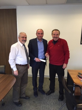 Başkan Özakalın ve yönetici Kaya, MHK Başkanı Yusuf Namoğlu ve MHK üyesi Bedri Dölkeleş’e “sabır” çekmeleri için birer Oltu Taşı tespih ediye etti…