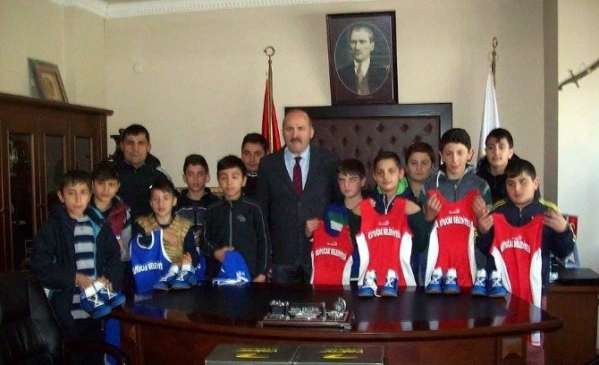 Kuyucak Belediye Başkanı Metin Ertürk genç güreşçilere malzeme dağıttı.