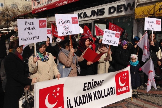Saadet Partisi Edirne İl Kadın Kolları üyesi kadınlar, Özgecan Aslan cinayetini protesto etmek için bir araya geldi. Saadet partili kadınlar, ’Önce ahlak ve maneviyat’, ’Hepimizin acısı Özgecan’ yazılı pankartlar açarak, Özgecan Aslan cinayetini ve kadına karşı şiddeti protesto etti.