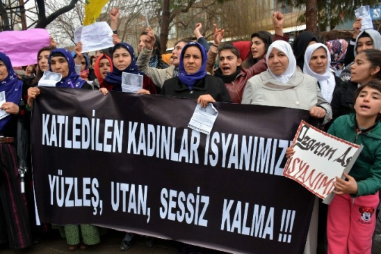 "Kadına yönelik erkek şiddeti her geçen gün daha fazla artarken, kadın cinayetleri de katliam boyutuna vardı. Birçok durumda şiddet yuvasına dönüşen ailelerde, kadınlar en yakınlarındaki erkekler tarafından öldürülürken, erkek şiddeti sokaklara, iş yerlerine, toplu taşıma araçlarına ve tüm kamusal alanlara yayılıyor. Kadın katliamlarının giderek arttığı son günlerde, Diyarbakır’ın Çermik ilçesinde eşi tarafından öldürülen Meryem Yılmaz ve en son Mersin’in Tarsus ilçesinde kayıp olarak aranan Özgecan Aslan’ın yakılmış cesedi bulundu. Kadın cinayetlerinin hızla artmasına neden olan erkek-yargı-devlet işbirliğine karşı hesap sormak için buradayız. Devletin hiçbir etkin önlem almadığı, çözüme yönelik irade ortaya koymadığı bu ülkede kadınlar her gün şiddet, taciz, tecavüz, cinayet tehdidi altında yaşamak zorunda bırakılıyor. Ne evlerde, ne de sokaklarda güvenliğimiz var. Soruyoruz, yapılan tüm yasal düzenlemelerin kağıt üzerinde kaldığı, taciz, tecavüz ve kadın cinayeti davalarında mahkemelerin erkeklik indirimi vermek için yarıştığı, toplumun tüm bunları neredeyse normalleştirdiği, basının haberleri failin ’gerekçeleriyle’ sunduğu bir ülkede erkek şiddetinden, kadın katliamından kim sorumlu?”
