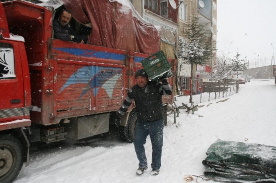 Yozgat’ta pazarcı esnafı, kar sebebiyle tezgah açamayınca araçlarına yükledikleri meyve ve sebzeleri tekrar depoya taşıdı.