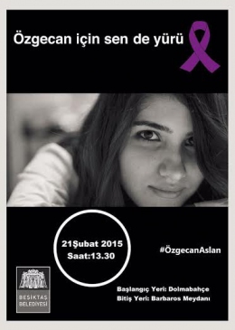 Beşiktaş Belediyesi, 21 Şubat Cumartesi günü Mersin’in Tarsus ilçesinde hunharca öldürülen 20 yaşındaki üniversite öğrencisi Özgecan Aslan için büyük bir yürüyüş düzenliyor. Özgecan İçin Sen de Yürü sloganıyla Dolmabahçe Sarayı önünde saat 13.30’da başlayacak yürüyüş, Barbaros meydanına kadar devam edecek. Cinayetlere kurban giden kadınların fotoğraflarının sergileneceği dev yürüyüşe denizden tekneler de eşlik edecek. Kadınlara yönelik şiddetin protesto edileceği yürüyüşe sanattan spor camiasına kadar pek çok ünlü isim katılacak.