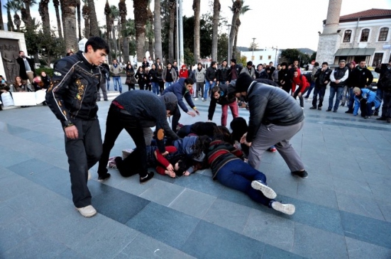 Mersin’in Tarsus ilçesinde öldürülen Özgecan Aslan’ı anmak ve kadına şiddeti kınamak için Bodrum Belediye Meydanı’nda toplanan Bodrumlu gençler, tiyatrolu protesto gösterisi gerçekleştirdiler.