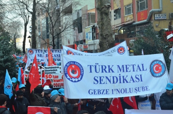 Kocaeli’de Türk-İş’e bağlı sendikalara üye işçiler kıdem tazminatının kaldırılmaması için eylem yaptı.