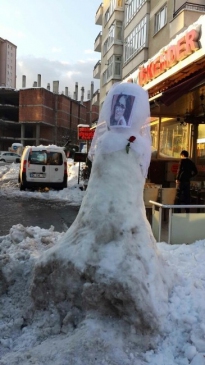 Pendik esnafı, yoğun kar yağışı sonrası yol kenarına kardan adam yaptı. Kardan adamın başına duvak geçiren esnaf, Mersin’de bindiği minibüsün sürücüsü tarafından öldürülüp yakılan üniversite öğrencisi Özgecan Aslan’ın fotoğrafını asarak, yakasına kırmızı gül taktı.