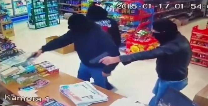 Jandarma operasyonuyla yakalanan soygun zanlılarının bir diğer silahlı soygun görüntüsü de markette kaydedildi. Yine silahlı ve kar meskeli olarak bir markete giren soyguncular , kasada bulunan görevliyi başına silahla vurarak etkisiz hale getiriyorlar. Görevli yerde acı içinde kıvranırken soygunculardan ikisi kasaya yönelip paraları alıyor. Kapı önünde kendilerini fark eden diğer görevliyi de yaka paça tartaklayarak market içine sokan soyguncular yerdeki görevlinin de üzerini arayıp ne varsa alıyorlar. Bu arada sordukları soruya cevap alamadıkları anlaşılan soyguncular, görevliyi yerde de tekmeliyorlar.