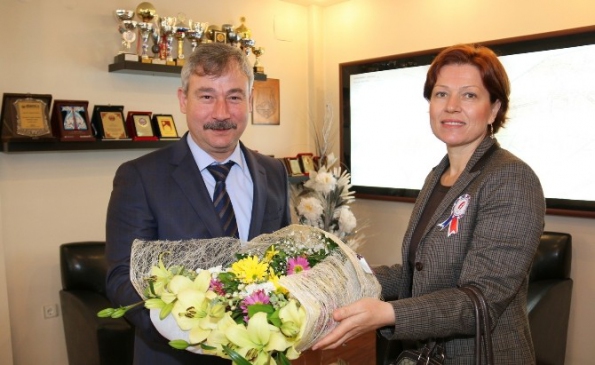 Vergi Haftası kutlamaları kapsamında Vergi Dairesi Müdür Vekili Sevgi Varışlı personeliyle birlikte Belediye Başkanı Hüseyin Yaralı’yı ziyaret ederek çiçek verdi.