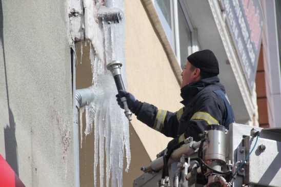 Nevşehir Belediyesi İtfaiye Müdürlüğü ekipleri, Nevşehir’in değişik merkezlerinde hava sıcaklığının mevsim normallerinin altında seyir etmesiyle özellikle yüksek katlı binalarda oluşan buz sarkıtlarının, vatandaşların üzerine düşerek olası istenmeyen bir durumun meydana gelmesinin önüne geçmek amacıyla buzları kontrollü bir şekilde imha etti.
