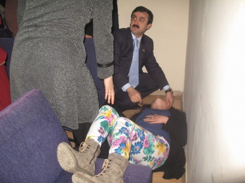 Göçer, konuşma yaptığı sırada partililer arasında bulunan ve baygınlık geçirerek yere yığılan kadına ilk müdahalede bulundu.