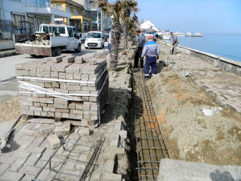 Mudanya ilçesi Demirhane Mevkii’ndeki sahil yolunun çöken ve tehlike oluşturan beton ayakları onarılmaya başlandı.