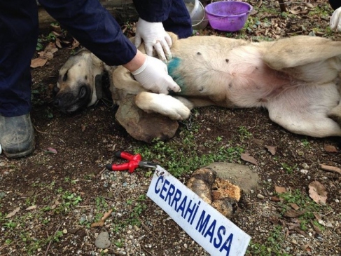 Domuz sürüsü tarafından karın bölgesinden yaralanan bir köpeği bahçesinde kurduğu tedavi merkezine alan Yıldırım, köpeğin yaralı bölgesine 8 dikiş attıktan sonra antiseptik, antibiyotik, ampul ve antibiyotik merhem, analjezik ilaç tedavisi uygulayıp, daha sonra köpeği yoğun bakım ünitesinde tedavi altına aldı.