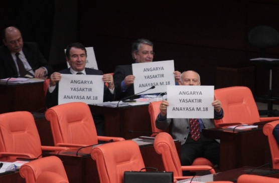 HDP’li ve CHP’li milletvekilleri TBMM Genel Kurulu çalışma saatlerini protesto ederek, “Angarya yasaktır Anayasa M. 18” yazılı döviz açtı.