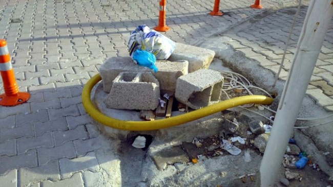 PTT’nin yan tarafındaki cadde üzerinde bulunan Özel Gözde Hastanesi’nin ön kısmında inşaat halindeyken açılan ve zemindeki suyun tahliyesinde kullanılan kuyunun üzeri tahta ve taş parçalarıyla gelişi güzel kapatıldı.