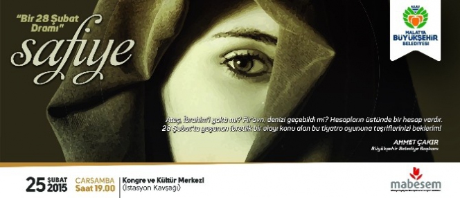 Malatya Büyükşehir Belediyesi Kültür ve Sosyal İşler Dairesi Başkanlığı tarafından 2015 Yılı Kültürel Etkinlikler Kuşağı kapsamında “Bir 28 Şubat Dramı-Safiye” adlı tiyatro gösterisi gerçekleştirilecek.