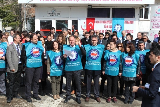 Sağlık-Sen Tekirdağ Şubesi üyeleri, Tekirdağ Devlet Hastanesi önünde basın açıklamasında bulunarak sağlıkçıların yıpranma payı ve ek ödemeler konusunda mücadelede bulunacağını belirtti. Sağlık-Sen Tekirdağ Şube Başkanı Hamza Öksüz, grup adına yaptığı basın açıklamasında, sağlık çalışanlarının haklarını koruyacaklarını belirterek, "Geçmişte yetkili sendika olanların hayal bile edemediklerini kazanıma dönüştüren Sağlık-Sen, sağlık çalışanlarına yıpranma payı verilmesi, ek ödemelerin emekliliğe yansıtılması, lisans tamamlama ve kreş konusunda kararlı bir duruş ortaya koymuş, mücadelesini sürdürmüştür. Toplu görüşme, toplu sözleşme, kurum idari kurul toplantıları dahil her platformda sağlık ve sosyal hizmet çalışanlarının taleplerini dile getiren Sağlık-Sen, geçen yıl 13 Mayıs’ta büyük Türkiye buluşması düzenlemiş, yıpranma payı, lisans tamamlama, ek ödemelerin emekliliğe yansıtılması ve kreş konularındaki taleplerini dile getirmişti. Yıpranma payının Bakanlar Kurulu ve ilgili platformlarda ele alındığını ve çalışmaların sürdüğünü, en kısa sürede bu sözün hayata geçmesi için çalışıldığını biliyor, konuyu takip ediyoruz. Bütün sağlık çalışanları, 2015 yılı içinde yıpranma payına kavuşmalıdır. Ek ödemelerin emekliliğe yansıtılmaması da sağlık çalışanlarının en önemli sorunlarından biridir. Ülkemiz sağlık çalışanları, sundukları hizmete göre gelişmiş ülkelerle kıyaslandığında ücret bakımından çok gerilerde kalmaktadır. Bu mağduriyet ek ödeme ve döner sermaye ile eşitlenmeye çalışılmakta, ancak ek ödemelerin emekliliğe yansıtılmaması başka bir mağduriyeti beraberinde getirmektedir. Sağlık çalışanları geleceğe endişe ile bakmaktadır. Emekli maaşları ek ödemesiz maaşa göre belirlenmekte, emekli maaşlarında büyük bir mağduriyet yaşanmaktadır. Bu sebeple 2015 yılı bizim için ek ödemelerin emekliliğe yansıtılmasının ve yıpranma payının hayata geçmesinin mücadele yılı olacaktır. Lisans Tamamlama konusunda da önce söz aldık, ardından bu sözün gereği olarak yasanın çıkmasına öncülük ettik. Bir meslek grubuna yönelik lisans tamamlama konusunda özel yasanın çıkmasını Sağlık-Sen sağlamıştır. Bu başarı, bu zafer Sağlık-Sen’indir. Çıkan yasanın uygulanması konusunda hem Sağlık-Sen’in, hem de Sağlık Bakanlığı’nın YÖK’le görüşmeleri sürüyor" dedi.