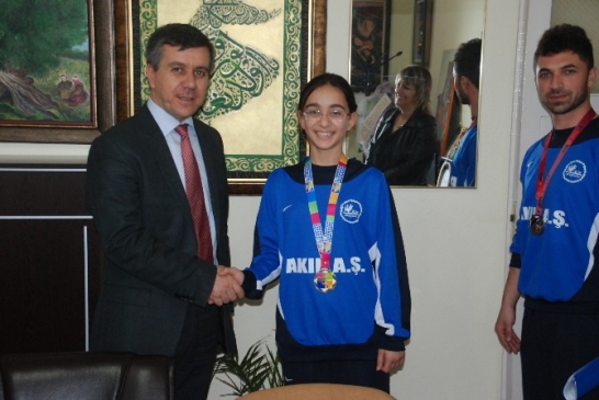 Ziyarete kurslarda Usta Öğretici olarak görev alan Antrenör Neja Ağatekin, yine Kurslarda Usta Öğreticilik yapan Sporcu ve Yardımcı Antrenör Şeref Firidinoğlu ile derece elde eden kursiyer sporcular katıldı. Nejla Ağatekin ziyarette “Halk Eğitimi Merkezi Müdürlüğümüze ve sayın müdürümüze açtığı kurslarla spora ve sporcularımıza önemli hizmetler sunmasından dolayı teşekkür ediyorum. Beyaz kuşaktan başlayarak kırmızı-siyah kuşağa kadar yükselen öğrencilerimiz katıldıkları uluslar arası bir turnuvada önemli başarılara imza atmışlardır. Bizlere maddi manevi desteklerinden dolayı teşekkür ediyoruz. Ayrıca turnuvaya katılmamızda sponsorlarımız oldu onlara da ayrı ayrı teşekkür ediyoruz” dedi. Merkez müdür İsmail Damar “ Bizler görevimizi yaptık emek veren hocalarımı, ve ter döken değerli kursiyerlerimizi sporcularımızı tebrik ediyor, kutluyorum.” Dedi. 1. Avrupa Minikler Tekvando Şampiyonasında derece alan öğrencilerden Aybüke Pamuk Avrupa Şampiyonu, Ayşenur İnci, Rumeysa Özmen ve Emre Ergit Avrupa üçüncüsü olarak madalyalarını gururla gösterdiler.