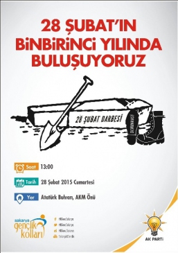 AK Parti Sakarya İl Gençlik Kollarından yapılan açıklamada, “28 Şubat Darbesinin yıldönümü dolayısıyla AKM önünde saat 13.00’te bir basın açıklaması yapılacaktır. AK Parti Sakarya İl Gençlik Kolları Başkanı Yusuf Demir’in okuyacağı açıklama ile AK Gençlik Kadroları olarak demokrasinin ayaklar altına alındığı, askeri vesayetin halkın iradesini yok saydığı bu kara güne dün olduğu gibi bugünde tepki gösterilecektir. AK Parti iktidarı ile darbeler ve vesayet dönemi sona ermiş, halkın iktidarından üstün olduğunu zannedenler tasfiye edilmiştir. Yeni ve sivil bir anayasaya doğru ilerlediğimiz bu günlerde 28 Şubat’ları unutturmamak adına, 28 Şubat’ta tüm Türkiye’de olduğu gibi Sakarya’da da meydanlardayız” denildi.