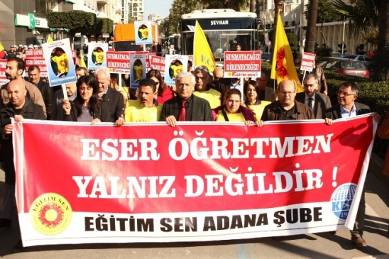 Adana’da, katıldığı Gezi eylemlerinin ardından, izinsiz gösterilere katıldığı gerekçesiyle hakkında disiplin soruşturması başlatılan ve 657 sayılı kanunun 125/E-a maddesi uyarınca ‘devlet memurluğundan çıkarma’ cezası verilen Eğitim-Sen üyesi öğretmen Eser Çapar için eğitimciler, Çapar’ın duruşması öncesi Adana Adliyesi’ne yürüdü.