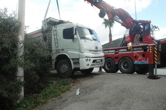 Kıbrıs Şehitleri Caddesi üzerende yol kenarında park halinde duran 48 KB 595 plakalı kamyon firenin boşalması sonucunda sitelerinde bulunduğu bölge hızlı bir şekilde ilerlemeye başladı. hızla sitelere doğru ilerleyen kamyon yol kenarında bulunan elektirik direğine çarparak dereye düştü. Sitenin yanında bulunan direge çarpması ise olası bir faciayı engelledi. Vinç yardımı ile düştüğü dereden çıkarılan kamyonda maddi hasar oluşurken Polis olayla ilgili inceleme başlattı. Yaklaşık 1 saatlik uğraş sonrasından kamyon güvenli bir bölgeye alındı.