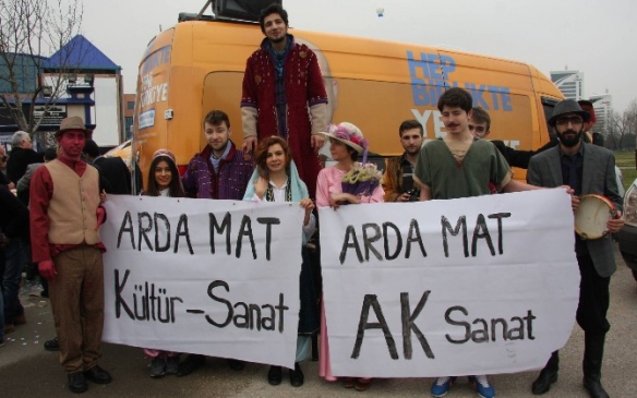 AK Parti Bursa Milletvekili aday adayı Arda Mat, Bursa’da yapılan temayül yoklamasında teşkilat üyelerinden öğrencilerinin yapmış olduğu tiyatro gösterileriyle destek istedi. Öğrencilerin tiyatro oyunuyla oy istemesi temayül yoklamasında renkli görüntülerin yaşanmasına sebep olurken, AK Parti üyeleri tiyatro oyununu beğeniyle izledi. Kültür ve sanatı mecliste tanıtmak için AK Parti Bursa Milletvekili aday adayı olduğunu ifade eden Arda Mat, "Ben kültür ve sanatında mecliste temsil edilmesini istiyorum. Sanatçıların sorunlarının da mecliste çözülmesi ve Bursa’nın sanat merkezi olması için adayım. Bursa’nın Hollywood gibi olmasını istiyorum. Bugün bana destek veren arkadaşların hepsi genç sanatçılar bana sürpriz yapıp çok güzel destek oldu. Bu gençlerin hepsi benim tiyatrodan öğrencilerim bugün bana yaptıkları sürprizle destek olan öğrencilerime 5 yıldır eğitim veriyorum" dedi.