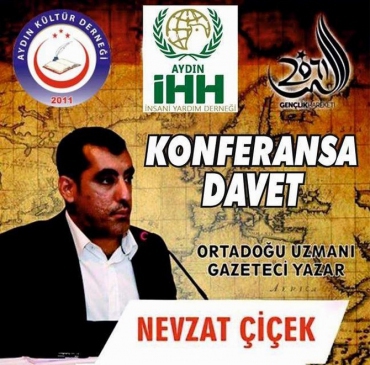 İHH Aydın Şube Başkanlığı, Aydın Kültür Derneği ve 2071 Gençlik Hareketi’nin ortaklaşa düzenleyeceği “Ortadoğu’daki Gelişmeler-İslam’a Karşı İslam Projesi ve Çözüm Süreci” konulu konferansa Ortadoğu Uzmanı ve Gazeteci-Yazar Nevzat Çiçek konuk olacak. Konferans, 05 Mart 2015 Perşembe günü akşam saat 20.00’de Aydın Kültür Merkezi Hidayet Sayın Konferans Salonu’nda gerçekleşecek.