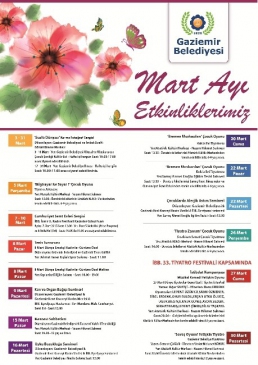 Ayrıca her ay çocuklara özel etkinlikler düzenleyen Gaziemir Belediyesi, Mart ayı etkinlik takviminde de çocukları unutmadı. Tiyatro sever minikler, Atatürk Kültür Merkezi’nde 5 Mart günü saat 15.00’de Bilgisayar ne Sayar, 20 Mart saat 13.30’da Bremen Mızıkacıları, 26 Mart saat 16.00’da Tiyatro Zamanı isimli çocuk oyunlarını seyredebilecek. Belediyenin sanat etkinliklerini ilgiyle takip eden yetişkinler ise, İBB 33. Tiyatro Festivali kapsamında Gaziemir AKM’de sergilenecek oyunlarla tiyatroya doyacak. Tiyatro severler, 27 Mart saat 20.00’da Dünya Tiyatrolar Günü’ne özel sergilenecek İstibdat Kumpanyası, 30 Mart saat 20.00’da ise Savaş Oyunu isimli oyunu seyredebilecek.
