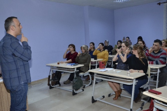 İşaret Dili kurs kapsamında ders veren Özel Eğitim Meslek Lisesi İşitme Engelliler Eğitmenlerinden Süleyman Bozkurt’ta, İşaret dili alfabesi ile başlayan kursun daha sonra temel kelimelerle devam ettiğini bildirerek, şunları kaydetti: "Haftada iki gün olan Pazartesi ve Cuma günkü kurslarımıza en uygun modüllerimizle eğitim veriyoruz. Aile içinde ve günlük yaşamda kullanılacak kelimeler başta olmak üzere bir eğitimimiz söz konusu. Hastane ve alışveriş ortamlarında en çok gerekli olan işaret dilini öğretiyoruz. Birçok ortamda yaşayarak gördüm. Hastaneye gittiğinde işitme engellilerimizin şikayetini doktorlarımız anlayamıyorlar. İşaret dili, işte bu yüzden önemli. Bir kadın çocuğunu kaybettiğinde ’Ben çocuğumu kaybettim’ demek için sesini çıkaramıyor ve bunu da karşısındaki kişiye anlatamıyorsa bu zaten en kötü durum ve işaret dilinin de amacı bu. Bunu anlayabilmek. İnsanları işaret dili kullanarak o bireyleri topluma kazandırmak. Bağımsız bir şekilde onların iletişim kurabilmesini sağlayabilmek için var işaret dili. Sağ olsun sayın başkanımız Orhan Bulutlar, bu konulara çok duyarlı böyle bir kurs açılmasına vesile olmasından dolayı kendisine, kursiyerlerim adına çok teşekkür ediyorum." dedi.