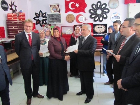 Vali Kamçı, Halk Eğitim Merkezi’ne geçerek burada bakır işlemeciliği kursunda kurs gören bayan kursiyerlerin yaptığı bakır el sanatlarını yakından inceledi. Çalışmaları çok beğendiğini ifade eden Vali Kamçı, bu güzel çalışmaların artarak devam etmesi temennisinde bulunarak, kursiyerlere kurs bitirme belgelerini verdi.