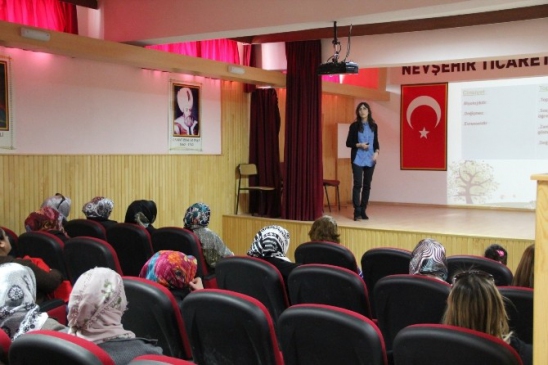 Nevşehir Anadolu Ahi Evran Ticaret Meslek Lisesi konferans salonundaki bilgilendirme toplantısında Nevşehir Belediyesi Kadın Danışma Merkezi psikoloğu Azime Tekin , ayrıca kadınların ekonomik yönlerdeki çalışmalarının yanı sıra, öğrenci velisi kadınların, kız çocuklarının ergenlik dönemindeki süreçte takınmaları gereken tutumlara ilişkin olarak da bilgilendirmede bulundu.