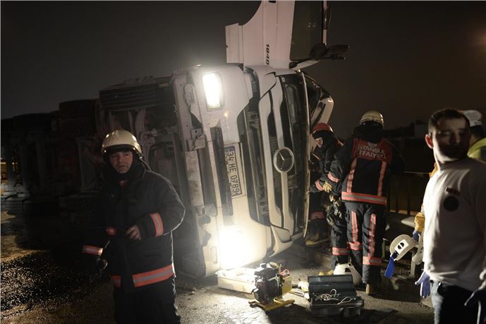Üsküdar'da, devrilerek bariyerde asılı kalan kamyonun sürücüsü, itfaiye ekiplerinin yaklaşık 2,5 saat süren çalışması sonucu sıkıştığı yerden kurtarıldı.Muhabir: Burak Akbulut